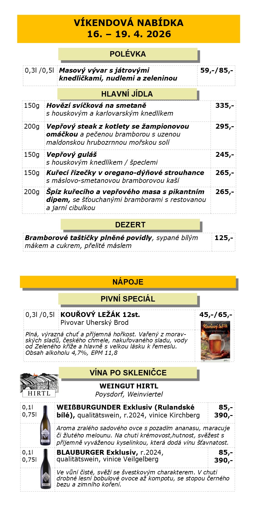 Dovolte, abychom Vám představili nabídku dalšího dubnového víkendu, která bude k dispozici tradičně od čtvrtečních 16.00hod. až do nedělní zavírací doby (resp. do vyprodání).