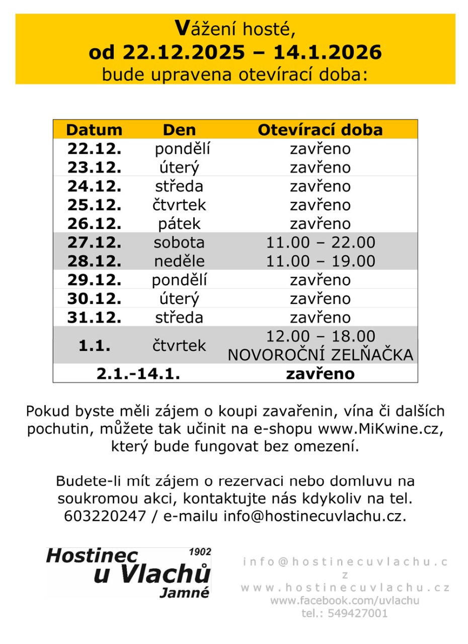 Po roce Vás opět srdečně zveme na tradiční NOVOROČNÍ ZELŇAČKU v první den nového roku, ve čtvrtek 1. 1. 2026! Co bude v nabídce? Samozřejmě silná a chutná Novoroční zelňačka, která bude tak hustá, že by po ní mohla kočka přejít! :) Čerstvě upečena budou i vepřová kolena a žebírka a...