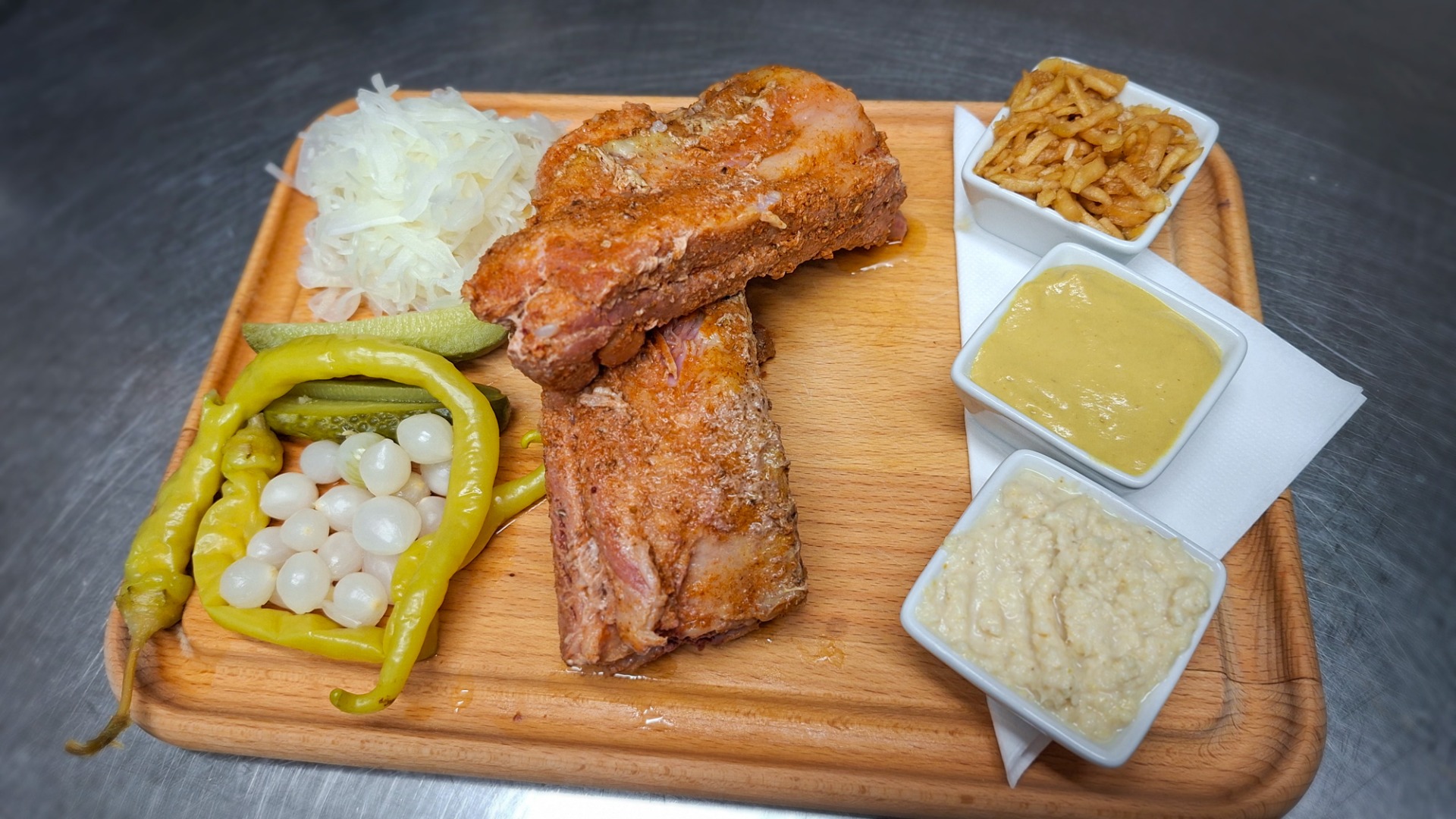 Objednat si můžete menší (cca 300g) nebo větší (cca 500g) porci. V ceně je obsažena zeleninová obloha, pečivo, hořčice a křen. Upozorňujeme, že se jedná o tzv. vyšší žebírka, i s částí bůčku. To znamená šťavnatá a chuťově bohatší.