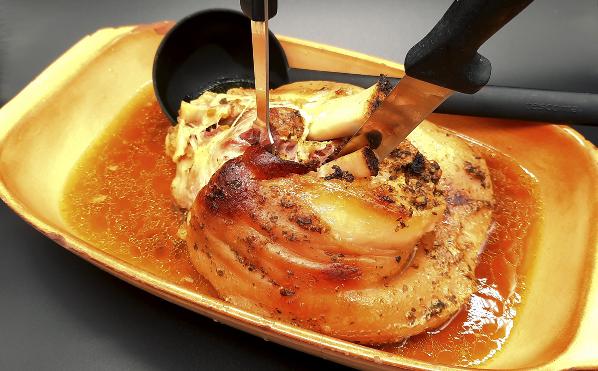 Čerstvé pečené vepřové koleno (vč. kostí) velikostí ideální pro dvě osoby. Váha je 1,2 - 1,8kg (s kostí). Cena obsahuje přílohové nakládané zelí, pečivo, hořčici a křen. Pokud porci nezvládnete, nevadí—zabalíme. Kolena prodáváme pouze v celku.