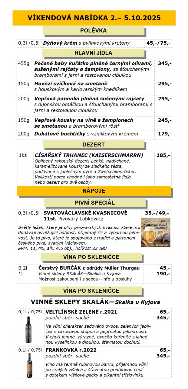 VÍKENDOVÁ NABÍDKA ČTVRTEK 2. - NEDĚLE 5.10.2025