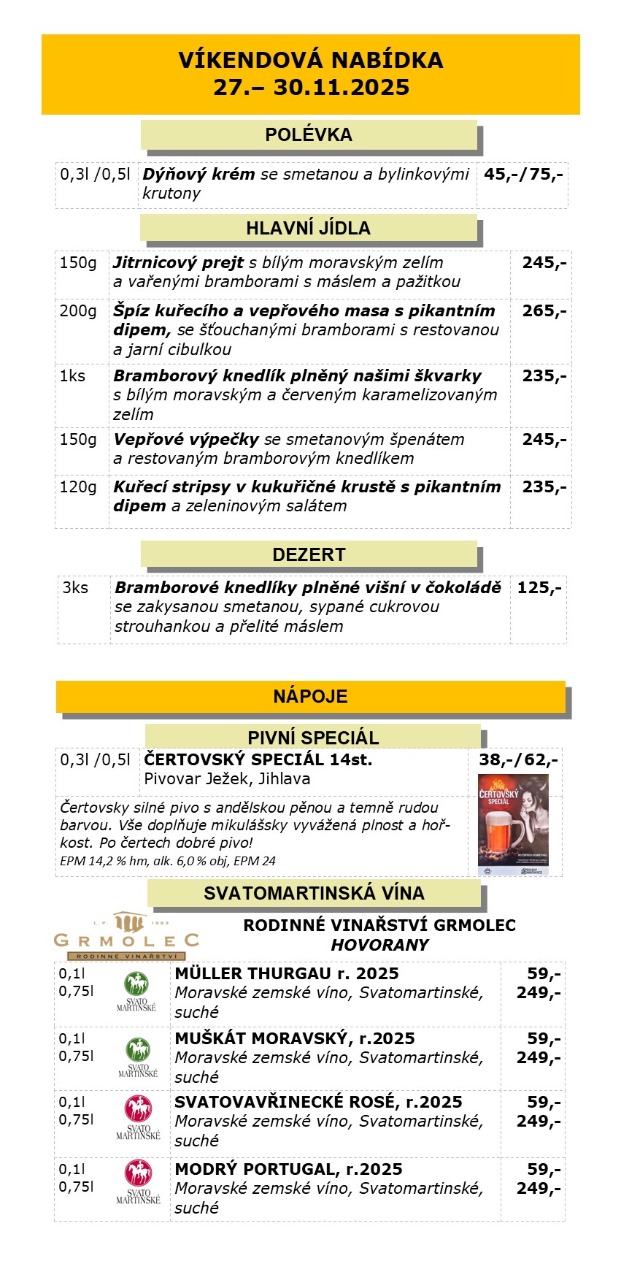 VÍKENDOVÁ NABÍDKA ČTVRTEK 27. - NEDĚLE 30.11.2025
